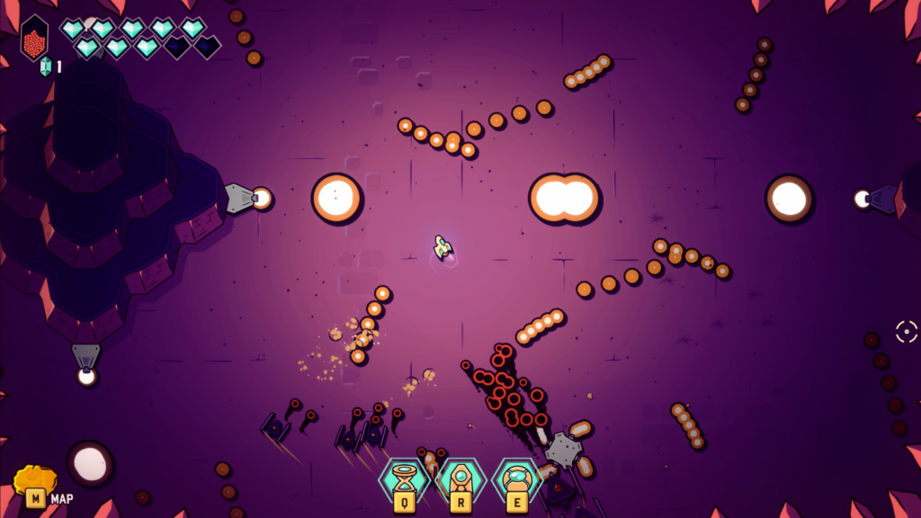 But none of that would matter if the combat wasn’t fun and that does keeps me drawn in. The combat is constantly fun to engage with. Overworld combat is quick and aggressive with enemies coming from all over as you’re running through the world between dungeons and small little reward areas. Stuff will pop in and come in from off screen, making you stay on your toes. Dungeons have much more controlled room-based segments where waves with specific patterns come in. Some force you to move around in ways to avoid bullet waves, some to avoid enemies charging you, some to force you to kill things fast or be overwhelmed. Bosses then lean full in to the bullet hell where it often becomes less important to quickly kill the boss, and more important to avoid damage as first priority. I could disconnect the Zelda/Metroidvania metagame aspects and this game would still be good and still be engaging to run through as just a straight boss sequence (…which they let you do in the post game!).