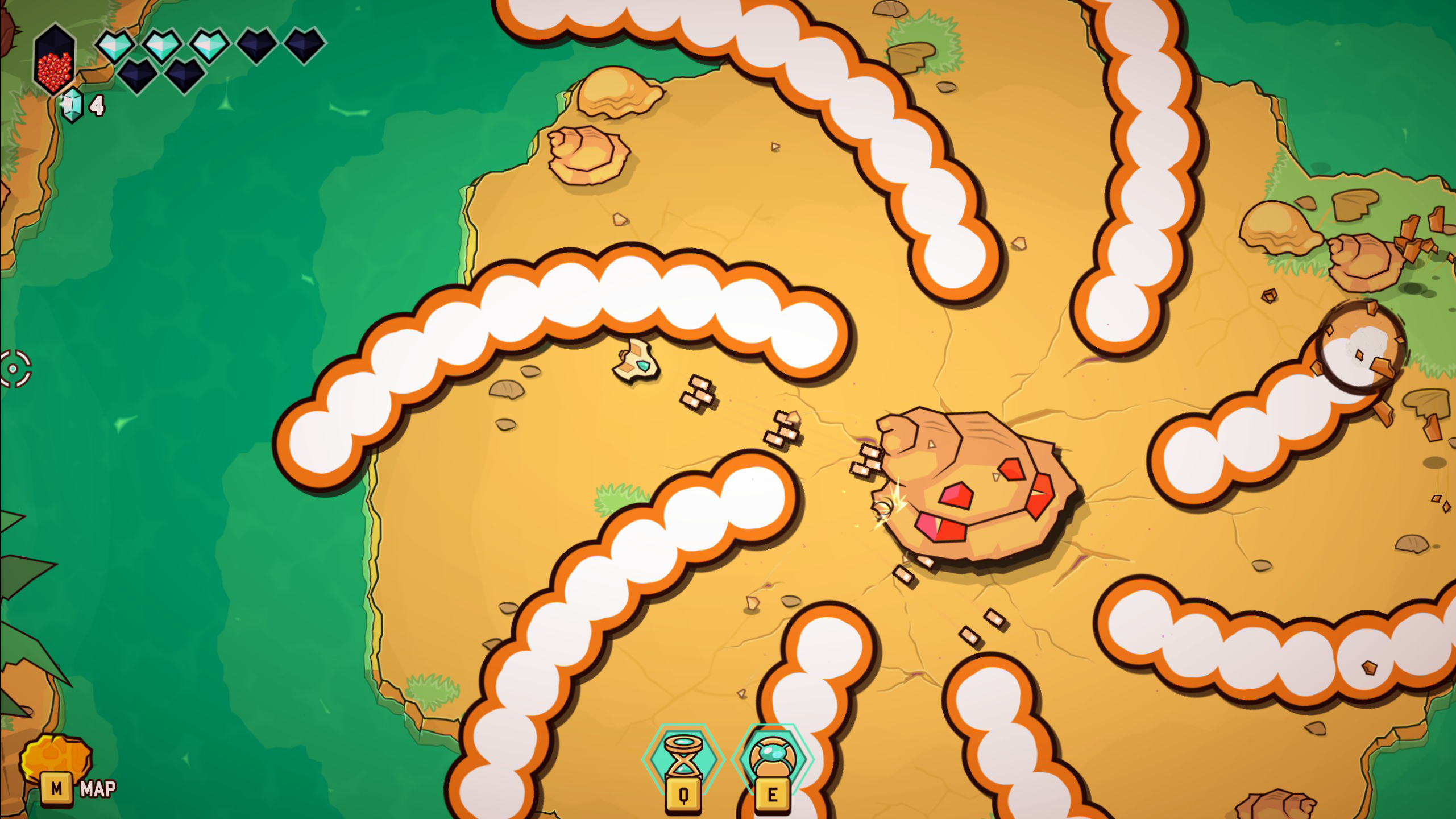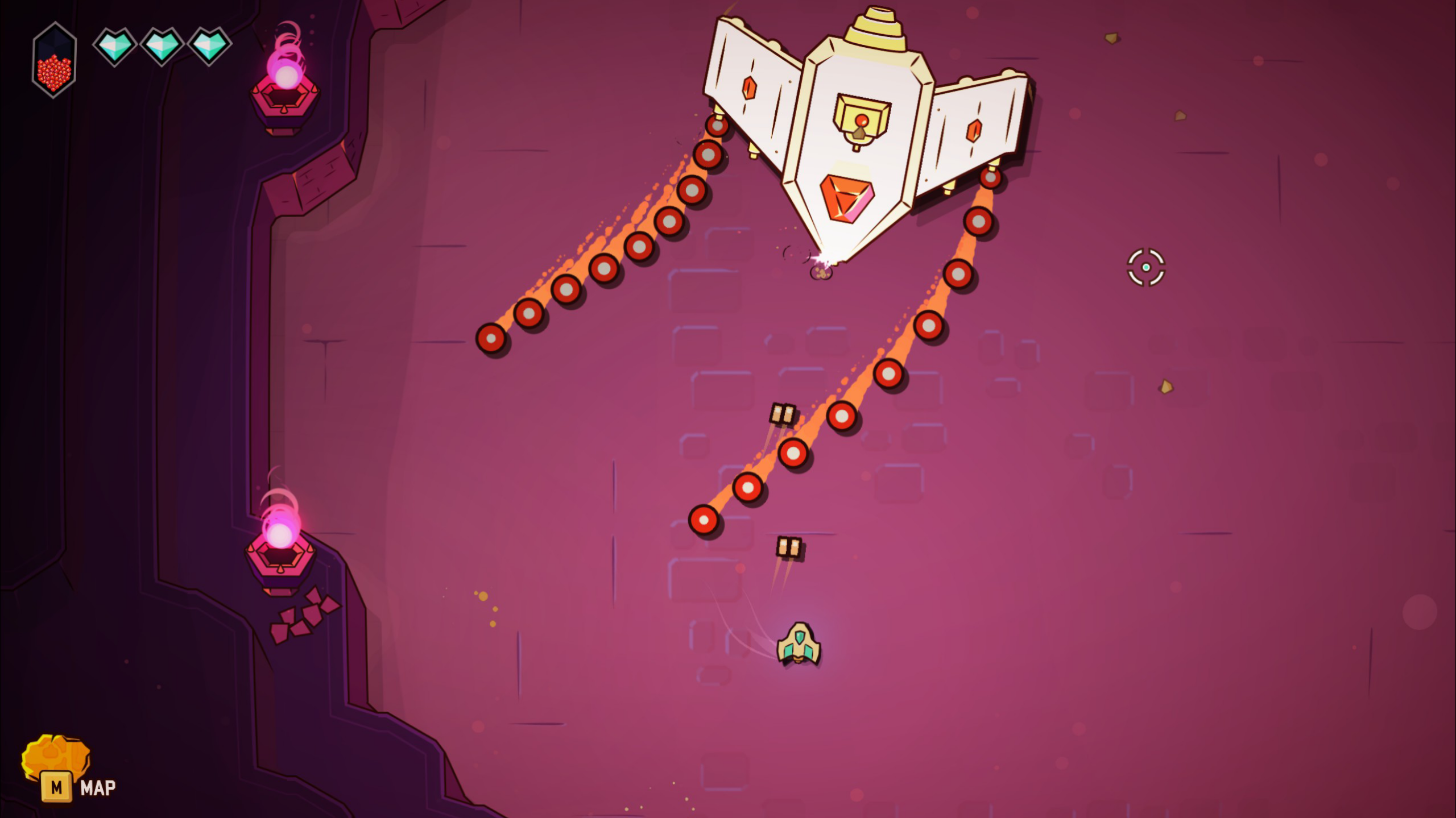 As an example, early on it becomes pretty obvious that you’re limited by things like gaps and water, both of which are blockers for the player traversal. The first few dungeons give you upgrades straight in this progression. First you get a basic boost to move faster, which you can use to clear gaps with ramps. You then earn a jumpy/teleporty/dodgy maneuver to clear gaps on your own. You then get an upgrade to allow you to hover on water. These are all things that are earned by completing dungeons, but unlike Zelda these aren’t things that you use to complete a dungeon. Frankly, the bosses are all generally able to be defeated without them – although dodging through bullets or using speed boost to get to weak points quicker is certainly recommended. However, the upgrades have their biggest impact in the overworld. Even the biggest direct offense upgrade – a charge-based overpowered set of bullets – is used more to break down walls than really push combat. It’s that use of upgrades as overworld capabilities that makes this feel more directly Metroid than I was expecting.