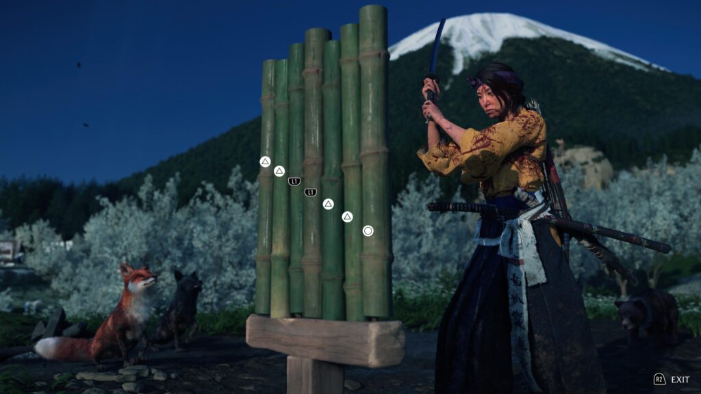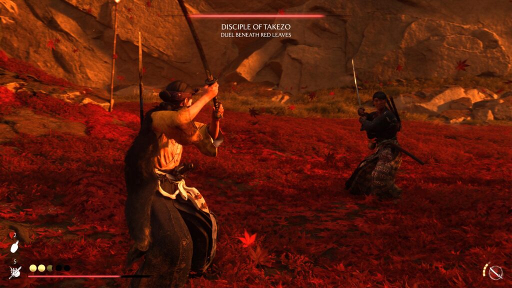 Part of it is that NPCs simply are better at taking turns. I know it sounds weird for a group of enemies to attack one-on-one, but from a gameplay perspective it makes sense for the player. Spamming dodge or parry buttons because multiple NPCs come after you more or less simultaneously is not a fun experience. Having the NPCs take turns – and more importantly giving the player time to attack the NPC that they successfully dodge or parry – is a big win in playability and letting the player feel powerful against a larger group of enemies. From a danger perspective it also felt like the NPCs would attack more quickly in succession if I wasn’t correctly dodging or parrying, so it encouraged me to be precise in order to not be overwhelmed. Another part of it for me is that rather than using stance switching to go against enemy weaknesses, Yotei uses weapon switching. From a result perspective this is exactly the same – you switch stance/weapon in both games to give yourself an advantage. However, recontextualizing this to something even more obviously visual feels better in a way that I can’t really place my finger on.