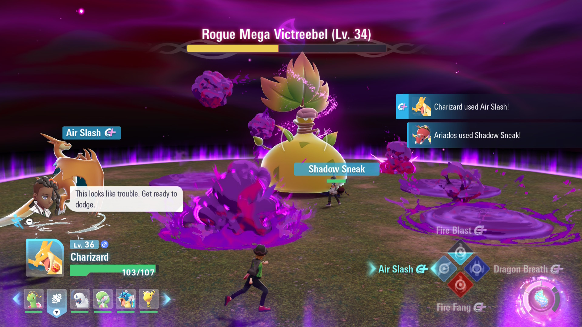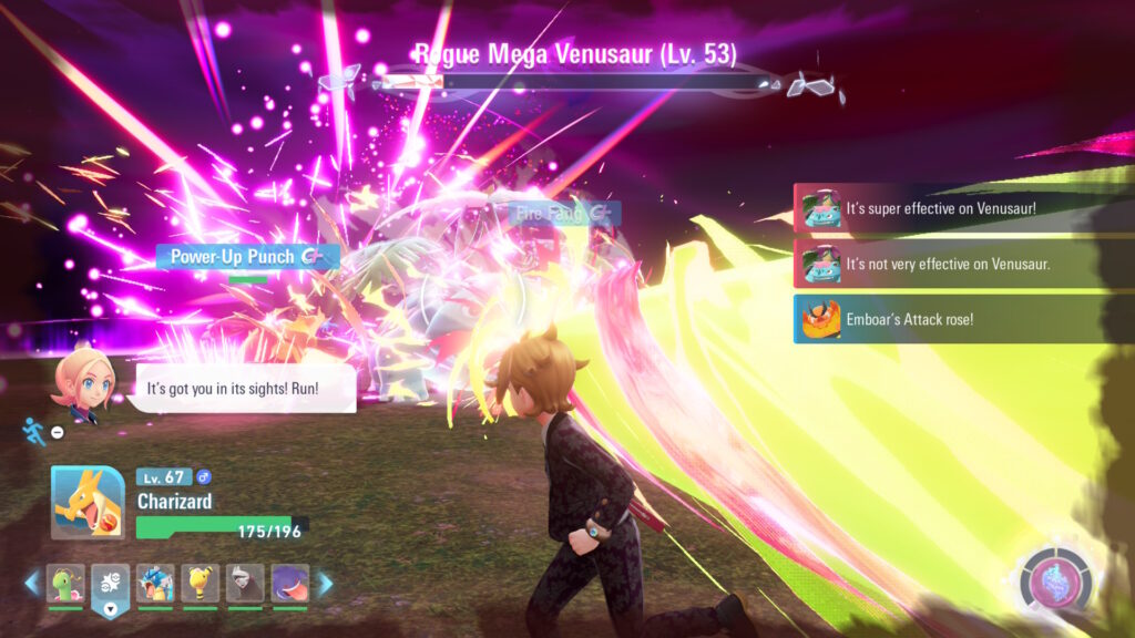 The first obvious problem is that I think the player’s active Pokemon has too little agency of its own to actively fight. All ranged attacks are relative to the player and the Pokemon tries to follow the player around if they aren’t being actively commanded, and that’s frustrating as hell. As a player, I have to reposition frequently to avoid being hit by attacks, which then causes the Pokemon to get into spots where it has to wildly reposition just to throw a ranged attack which is always at a fixed spot relative to the player’s position, wasting a bunch of time while it repositions. The Pokemon then often gets into spots where its ranged attacks hit things that it should simply be obviously avoiding. It might be an edge of a fence or a tree or the top of a stair that will clip the attack, blocking it from hitting. It’s just consistently dumb as shit that this occurs, because a Pokemon should clearly be instinctively smart enough to reposition itself a bit to avoid this.